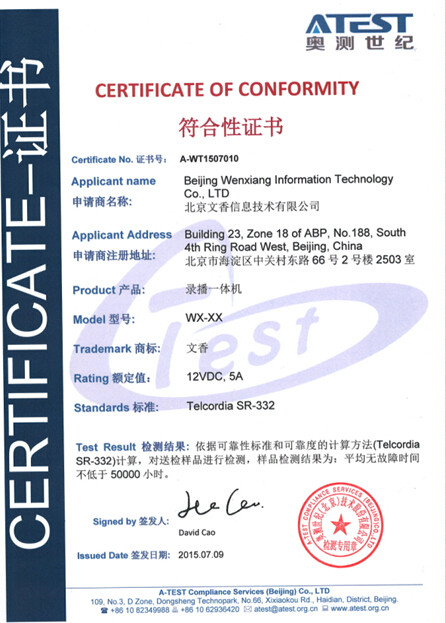 近日,从中国质量认证中心签约检测实验室奥测世纪获悉,北京文香嵌入式录播一体机已经通过该中心严格的MTBF测试,平均无故障工作时间达到50000小时。据奥测世纪负责人介绍,该数据开创了录播一体机平均无故障工作时间的新纪录。奥测世纪为此还给北京文香颁发了国际认证的检测证书。