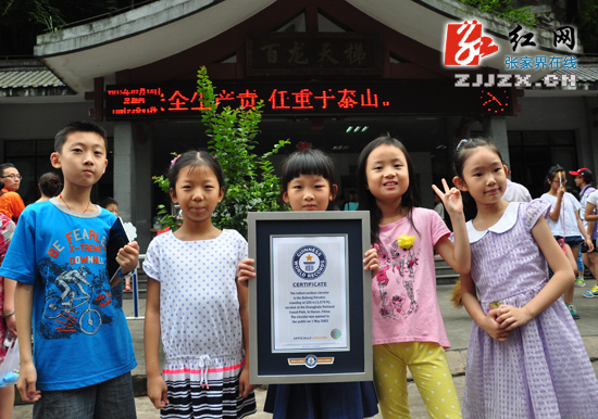 来自上海的小游客们与证书合影红网张家界站7月16日讯(分站记者 廖秋萍)“在大中华区域内所有创造吉尼斯世界纪录中,是最高、最有意思、最美丽的。”7月16日,位于张家界核心景区袁家界的百龙天梯创造了一项新的吉尼斯世界纪录荣誉。吉尼斯世界纪录有限公司大中华区总裁罗文出席了当天的创造吉尼斯世界纪录荣誉证书颁发暨速度·安全双升级剪彩仪式,并祝贺升级完毕的百龙天梯创造了一项新的世界记录——“最高户外电梯”。