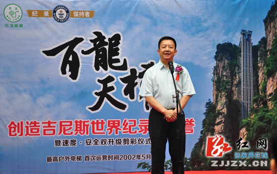 市委常委、副市长程丹峰出席证书颁发暨剪彩仪式并致辞。程丹峰说,张家界武陵源风景区拥有中国第一个国家森林公园、第一批世界自然遗产、第一批世界地质公园、国家首批5A级旅游景区等荣誉。张家界创造了很多奇迹,而百龙天梯也一直朝着这个方向努力,尤其是此次百龙天梯提质升级以后,容量和速度有了进一步提升,将会给广大游客带来更多便捷,也将大幅提升景区的服务接待能力。