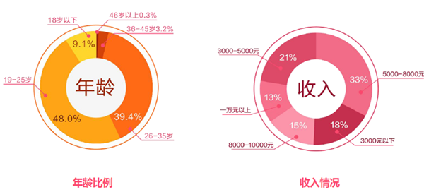目前美柚的用户年龄层主要集中在18—35岁的女性,其中19—25岁的年轻女性占到48%,26—35岁女性占比39.4%,个人收入在3000—10000元的用户比例达到7成。本科以上学历的女性占到52%。用户量排名前六的地区分别为北京,广东,上海,江苏,浙江和福建,这些地区用户消费水平相对更高,线上付费习惯也更好。