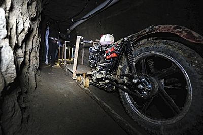 越狱隧道内部,停着一辆安放在轨道上的摩托车。