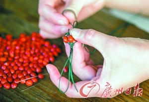 据介绍,传统丹霞红豆的编织制作工序包括捡红豆、洗红豆、选红豆、红豆打孔、编织红豆五道。