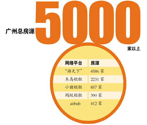 记者搜索各大网络平台发现,广州作为在线短租的巨大市场,房源数量也是突飞猛进。“游天下”登记了有4586家包括公寓、民宿、别墅等等在内的住房,木鸟短租有2231家,小猪短租有857家,蚂蚁短租有390家。国外最火的airbnb网站,在广州也有412家房源。鉴于存在居民在不同的网站上录入了相同房源的情况,保守估计,广州起码有5000家以上。