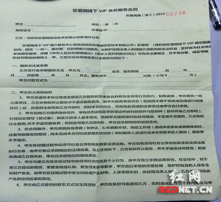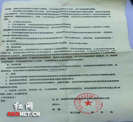 杨小姐回到家仔细看了合同之后,感觉合同内容不能保障自身任何利益,“回想整个过程,觉得自己在这种模式下有种被欺骗的感觉,因为珍爱网并没有给出合适的男士资料给我过目,服务也没有像他们所说的那样。”