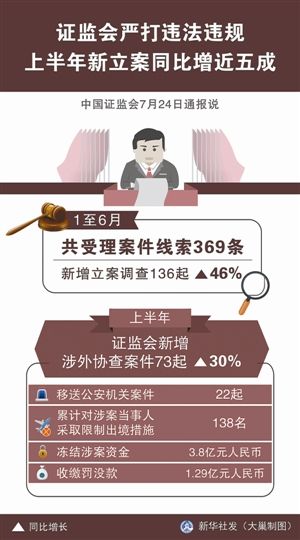 中国证监会24日通报说,今年上半年证监会强化证券期货市场违法违规打击力度,1至6月共受理案件线索369条,新增立案调查136起,同比增长46%。