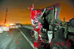 油罐车撞上了护栏。广州日报记者曹景荣 摄