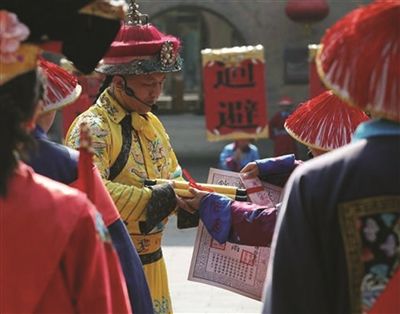 7月25日上午9时,10名高考状元身穿状元服,肩披大红花,骑着高头大马,进入皇城相府御书楼广场,“康熙皇帝”敕封他们为“第一甲状元赐进士及第”,每人赏“诏书”一册、人民币10000元,《康熙字典》一函。