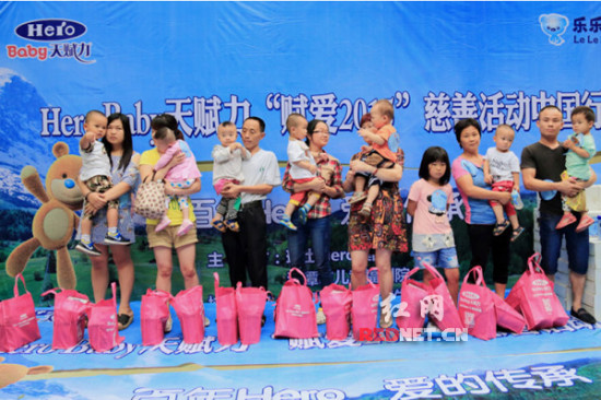 红网长沙7月27日讯(记者唐频辉)7月25日,以“百年Hero,爱的传承”为主题的Hero Baby天赋力“赋爱2015”慈善活动中国行在湘潭隆重举行。Hero集团向患有复杂性先天性心脏病、肺动脉闭锁等多种病的3岁儿童小雪筹款、为她捐出5000元爱心善款,并向50户贫困家庭依次捐赠慈善礼包(每户获赠价值1500元的Hero Baby天赋力进口奶粉),还为湘潭市儿童福利院送去了价值15万元的奶粉。湘潭是Hero集团“赋爱2015”慈善活动中国行的首站。