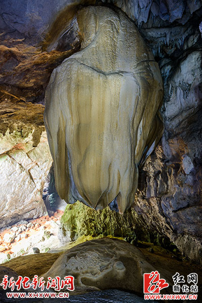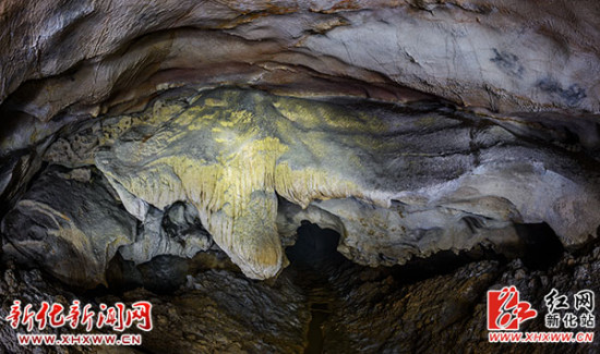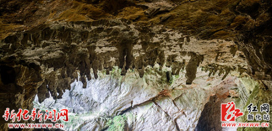 通风洞进洞口顶上悬挂的众多石钟乳红网新化站7月27日讯(分站记者 黎明明)在新化县桑梓镇大坪村,发现湘中首个神秘天坑,直径约50-60米,深约50米左右,南北与洞穴相洞,溪流贯穿其中,洞中有古人生活遗迹,曾经淘过金。