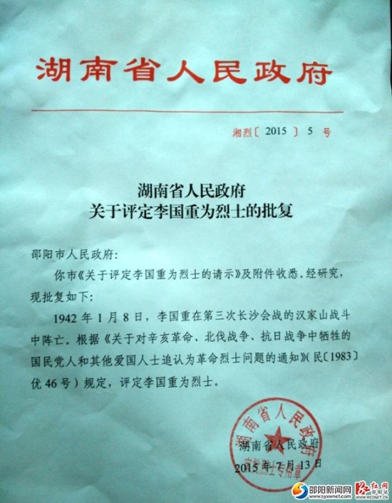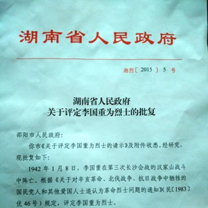 根据民政局印发的《关于对辛亥革命、北伐战争、抗日战争中牺牲的国民党人和其他爱国人士追认为革命烈士问题的通知》(民[1983]优26号)精神,7月13日湖南省人民政府批准李国重为烈士。