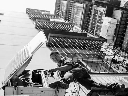 在霍州,一名空调维修工冒着酷暑维修空调外机,当日当地最高气温达到36℃ 本报拍客乔晶明摄
