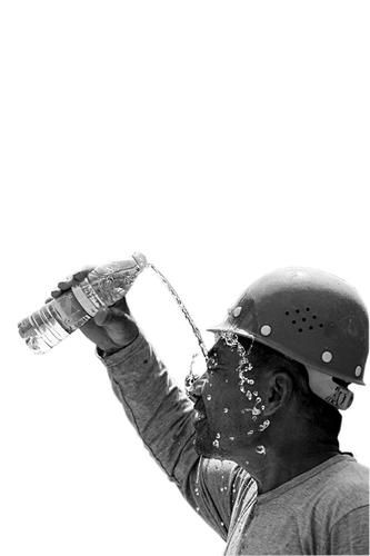在临汾,一名建筑工人用水浇脸降温 本报拍客张蕴强摄
