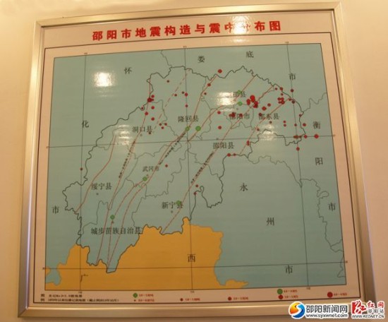 邵阳市地质构造和震中分布图,主要集中邵东、新邵、洞口等县