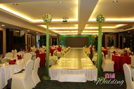 位于酒店五楼,唯一一间承办中小型婚礼的宴厅,总面积400㎡(38.2长*10.6宽*3.2高),进门靠左手有两根方形柱,最大容量30桌,在有舞台和T台的情况下可摆放21桌中式婚宴,课桌式西式宴席可容纳230人。有LED屏,提供投影仪。将边上的2号厅和3号厅运用起来,整层楼可摆放近40桌宴席。15桌起订或保底消费30000元(只要达到保底消费,保底桌数将不受限制)。