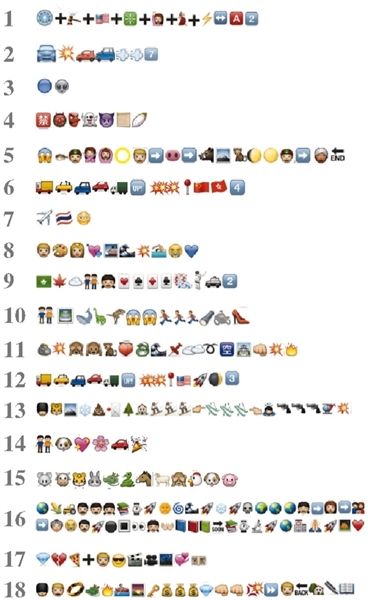 看Emoji猜电影,甚至还成为了APP上的一款游戏。Emoji是什么?就是手机里自带的图标啊,有表情、场景、动物、美食、交通工具等。上周,索尼公司还打算将Emoji拍成大电影。接着也说点跟咱们有关的东西,由于本月暑期档表现强劲,内地票房榜经历了一次小小的洗牌。不如通过Emoji猜谜游戏,让我们回顾这些电影都讲了什么故事吧。小提示:左边的Emoji图标和右边的电影榜单对应不上,请你为两边连线,或为18部影片填上左侧对应的序号。正确答案在底部哦。