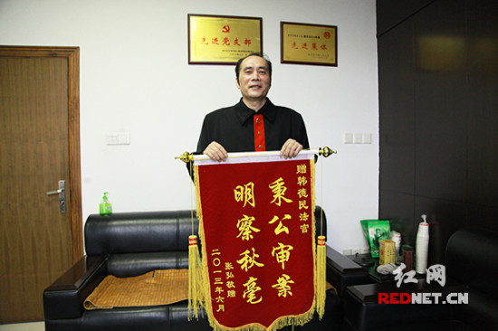 (韩德民转业进入法院工作后,秉公办案,图为当事人为韩德民赠送的锦旗)