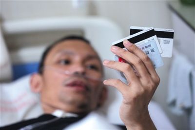 7月30日,朝阳六里屯社区卫生中心,韩振奎躺在病床上拿着银行卡好像在回想什么就是不放手。新京报记者 侯少卿 摄