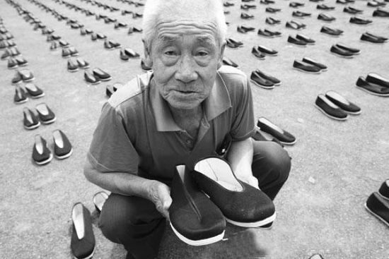 中国被掳劳工幸存者李铁锤颤抖地捧起一双象征死难劳工的布鞋。8月3日,联合声明发表仪式现场。