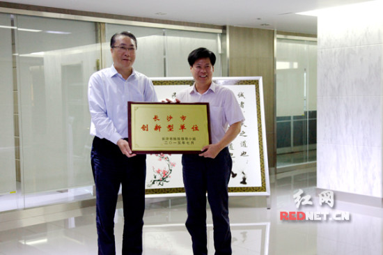 (宁乡经开区荣获长沙市创新型单位,长沙市科技局党组书记、局长赵跃驷[左]向宁乡经开区党工委副书记、管委会主任戴中亚[右]授牌)