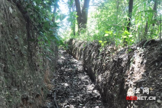 记者走近河洑山战壕和暗堡遗址,但见战壕的造型与人工水渠相似,沟深半米,顺着山势蜿蜒而建,蹲在战壕内,整个人可以完全“隐身”其中。
