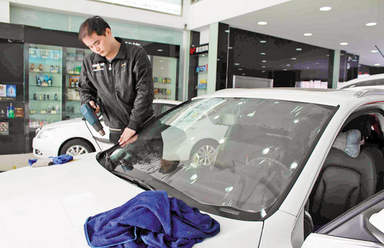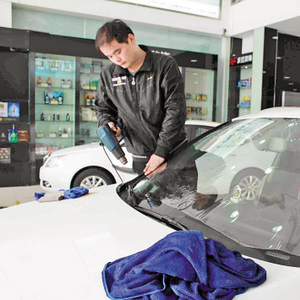 在佛山华南汽车城的一家汽车美容店内,记者看到几个年轻车主正在给车贴膜。“之前的膜是4S店送的,效果一般,用了两年多了就来换个好的。”一位车主说,换的是隔热效果好的太阳膜。