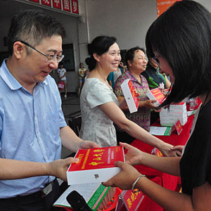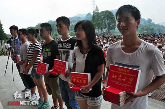 考上北京大学的谭智威(右一)获得了8万元现金奖励。红网长沙8月6日讯(时刻新闻记者 易征洋 通讯员 张磊)红绸包裹的大摞现金、贴着红色喜报的平板电脑,被整齐地摆放在主席台上,等着被台下学生领走。今天,在湖南省耒阳市正源中学的高考庆功会暨颁奖会上,30名高分学子一齐上台领取了他们的高考奖励——一台iPad,而成绩排名耒阳市前列的谭智威、谢卓、唐潮等6名学子还拿到了1万元到8万元不等的奖学金。