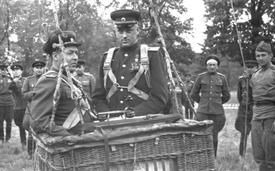 罗科索夫斯基元帅(右)与同事乘吊篮。