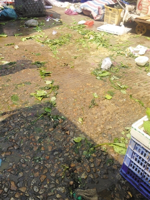中图:蔬菜摊位中稍有空地就会成为摊主们的公共垃圾堆放处。往往还伴有废水,散发出难闻的气味。