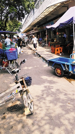 左图:记者日前看到,群星沙井明珠街市外部的两侧有许多快餐店,车辆胡乱停放在路边,白色垃圾堆积。