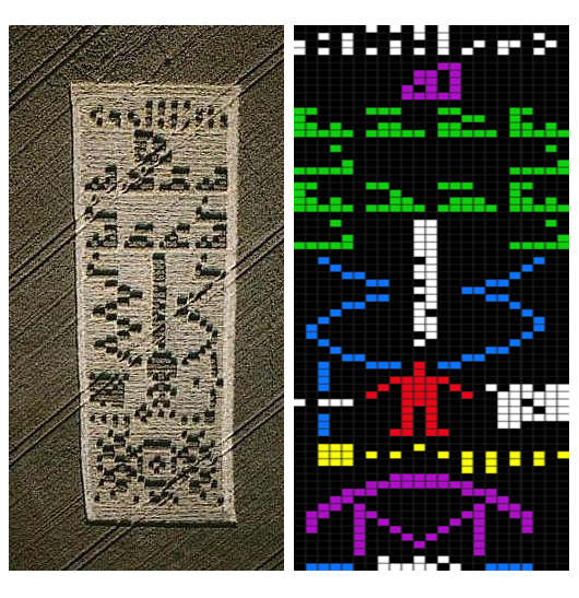 一直等到了2001年8月,人们在英国汉普郡的Chilbolton射电望远镜旁发现了一个麦田圈,竟然与阿雷西伯信息图格式完全一致,似乎是一封回信。要知道,1974年发出的“阿雷西伯信息”,非常隐秘,只有为数不多的科学家知道!能这么“大手笔”回信的人,你说可能是谁?