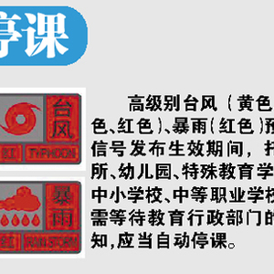 高级别台风(黄色、橙色、红色)、暴雨(红色)预警信号发布生效期间,托儿所、幼儿园、特殊教育学校、中小学校、中等职业学校无需等待教育行政部门的通知,应当自动停课。