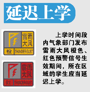 上学时间段内气象部门发布雷雨大风橙色、红色预警信号生效期间,所在区域的学生应当延迟上学。