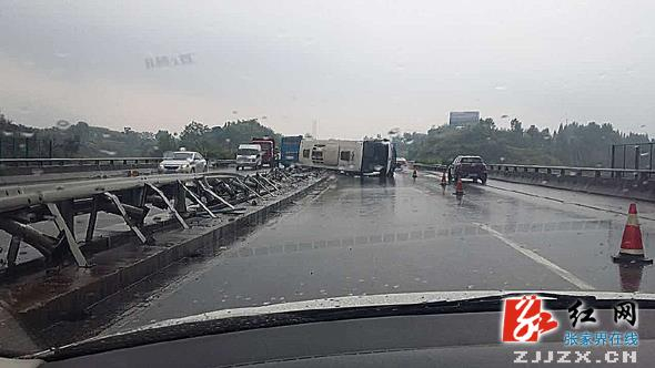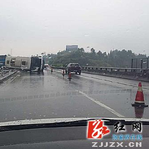 红网张家界站8月13日讯(通讯员 王健)8月12日下午2点12分,在张家界东入口距慈利方向约两公里处的常张高速路上发生交通事故。据现场目击群众介绍,由于受阴雨天气影响,路面湿滑,能见度低,一辆从长沙至张家界的旅游大巴侧翻在中间的护栏上,车上载有30名乘客,车祸现场现场一片狼藉。