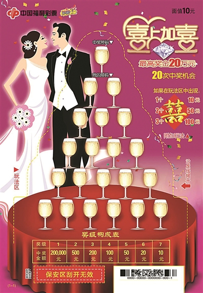 彩票请柬合二为一,面值10元,最高奖金20万元。亲爱的恋人们,您一定在忙着策划和筹备您的婚礼,您一定在着急选购一款精美别致的请柬,邀请您的亲朋好友参加您的婚礼,一起分享幸福和甜蜜。您一定在犹豫选一款怎样的回礼,才能表达对参加婚礼的亲朋好友们的谢意。不用着急,不用犹豫,福利彩票刮刮乐是您的首选好礼,一定会让您的婚礼“喜上加喜”!