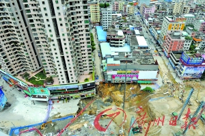 塌坑扩大,周边建筑部分悬空了。 广州日报记者卢政摄