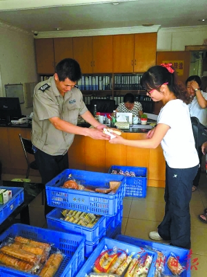 联邦大厦管理处昨日为住户免费发放面包。 广州日报记者谢英君摄