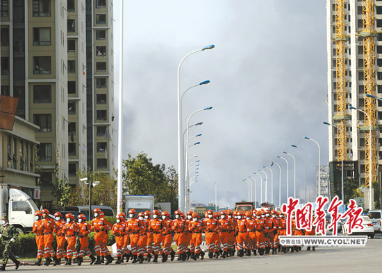 13日下午4时,中国青年报记者在靠近爆炸地的道路两旁,看到了正在集结待命的武警战士和消防官兵。数百名武警战士到达这里后,立刻赶往前方救援现场的道路附近,为消防救援车辆清理路障。