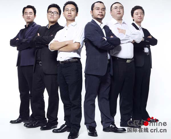 凤凰新闻客户端主笔团合照,从左至右依次为凤凰新闻客户端总经理傅泗航、凤凰新闻客户端主笔运营总监蔡信、王路、唐驳虎、刘三解、龙舟