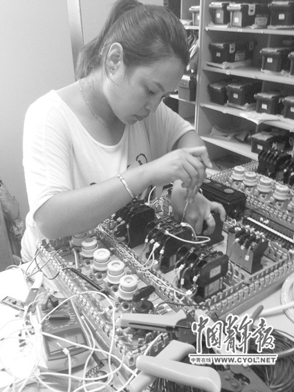 ????新疆库车中等职业技术学校的女教师在安装星形-三角形降压起动控制系统。