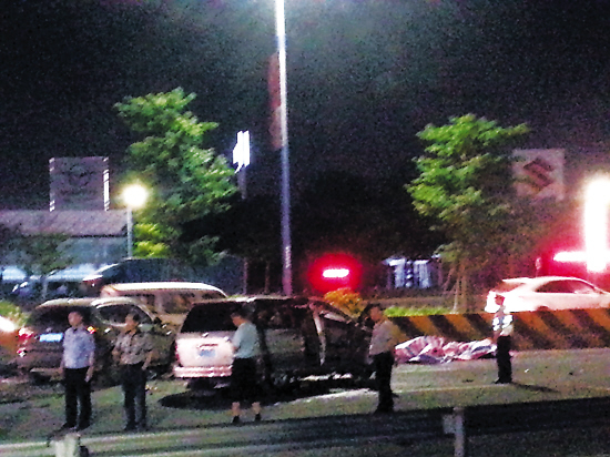 8月12日晚10点,记者赶到现场时,南海警方已封锁现场。记者看到,在谢叠大桥往罗村方向上桥位辅道上,一辆粤Y牌宝马SUV和一辆粤E牌起亚商务车分别撞在分割主辅路的石墩隔离栏上。隔离栏起点的粗石墩整个被撞碎,第一节石墩隔离栏也被撞偏离原来的位置,可见撞击过程之严重。SUV损伤并不严重,只是前方保险杠脱落,但商务车整台车都被撞变形,车头被撞毁,驾驶位完全变形,副驾驶位一侧车门已被消防员撬开。此外,商务车左后轮轮毂变形,有被灼烧的痕迹。旁边的路上,3块帆布盖着3具遗体,记者从远处看到,死者均为男性,大约30岁左右。