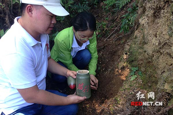 (在战壕遗址内,报道组捧取了沾有抗战先烈热血的泥土,装进了象征胜利的子弹陶罐内,带回长沙)