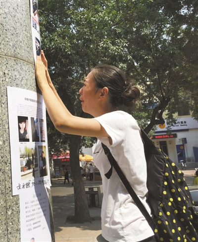 天津市第五中心医院,王雅茹粘贴好弟弟的寻人启事后,摸着照片哭。