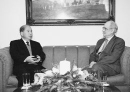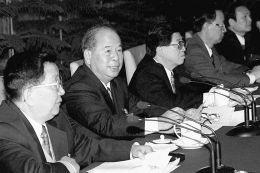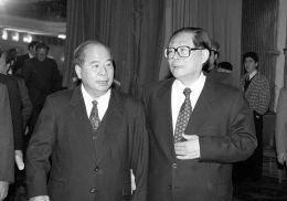 1996年11月12日,全国政协在人民大会堂隆重举行孙中山先生诞辰130周年纪念大会。这是出席活动的江泽民同志和尉健行同志在一起交谈。