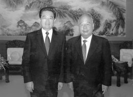 2009年10月1日,首都各界庆祝中华人民共和国成立60周年联欢晚会在北京举行。这是出席活动的胡锦涛同志与尉健行同志合影。