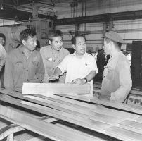 尉健行同志任黑龙江东北轻合金加工厂厂长时,在车间和工人交流。
