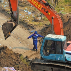 救援人员正在挖土填埋危化品。