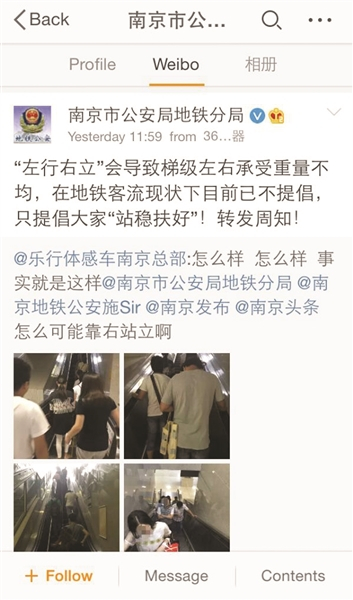针对“左行右立”这一舶来文明礼仪,日前,南京市公安局地铁分局在官方微博上发布了一条挺有争议的“倡议”:“左行右立”会导致梯级左右承受总量不均,在地铁客流现状下目前已不提倡,只提倡大家“站稳扶好”!转发周知!