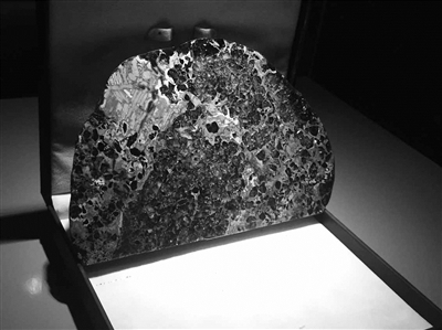 科普部的张旸主任首先给晨报记者介绍的是镇馆之宝——火星陨石。这块陨石并不大,表面覆盖着黑黢黢的“熔壳”,就是在坠入地球时,表面在大气层中高速摩擦燃烧形成的炭黑色表皮。记者获准伸手掂量了下这块小石头——嚯,分量还不轻呢!这块最初在非洲西北部发现的小陨石,其价值却难以估量,因为全世界目前已知的火星陨石总共不过数百块。而且,多数陨石来自于火星和木星间的小行星带,只有极少的部分是来自太阳系的两个星球——火星和月球,而这其中又以火星陨石更珍贵。