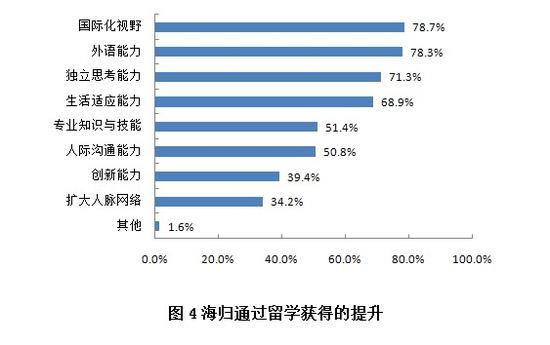 海归认为其留学的优势主要体现在语言、沟通能力方面,分别有64.3%和51.7%的海归认为自己在这两方面具有优势。分别有50.1%和48.8%的海归认为自己在专业技能和创新能力方面具有优势。另有38.6%认为在自我推介能力占优势。仅有15%的海归认为自己在人脉网络占优势。