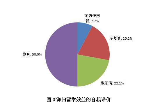 随着近年来留学人员的快速增长,海归也日益增多,加上国内高校毕业生数量巨大,全球经济放缓,海归群体面临的就业压力不断增大,相比较高的留学成本,留学效益成为人们关注的焦点,围绕留学“划算”还是“不划算”的讨论成为社会话题。调查显示,海归群体中,认为留学划算的占50.0%,不划算的占20.2%,说不清和不方便回答的分别占22.1%、7.7%。